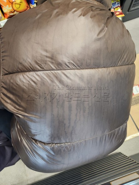 패딩에는 빗물이 떨어져 흐르고 지나간 자국이 그대로 남아 지워지지 않았다. 고객센터에 환불을 문의하자 상담원은 "드라이 제품이라 물에 젖으면 그런 현상이 나타날 수 있어 고객 과실"이라며 "담당 역량이 아니니 한국소비자원 등 상위 기관에 상담을 신청해 판단 받도록 하라"고 답했다.