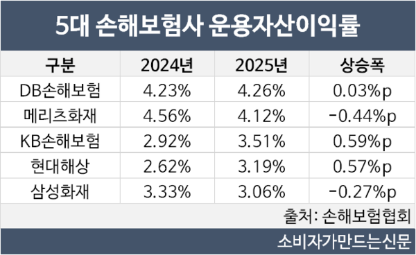 7일 손해보험협회에 따르면 지난해 자산규모순 5대 손해보험사의 운용자산이익률은 3.06~4.26%로 집계됐다. DB손해보험, KB손해보험(대표 구본욱), 현대해상(대표 이석현) 3곳은 이익률이 전년 대비 상승했으나 삼성화재와 메리츠화재(대표 김중현) 등 2곳은 떨어졌다.