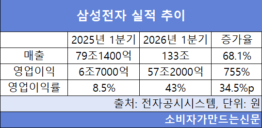 7일 삼성전자는 올해 1분기 연결 기준 매출 133조 원, 영업이익 57조2000억 원의 잠정실적을 기록했다고 밝혔다.