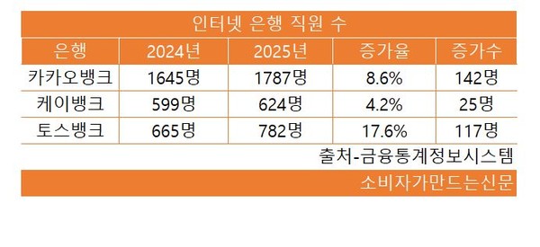 인터넷전문은행 관계자는 “직원 1인당 생산성은 하락했지만 시중은행 대비 여전히 높은데다 업력이 짧은 인터넷전문은행 특성상 채용은 지속 확대할 것”이라고 말했다.