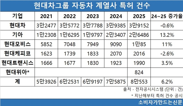 반면 현대자동차(대표 정의선·무뇨스)와 현대케피코(대표 오준동)는 특허 건수가 소폭 줄었다.