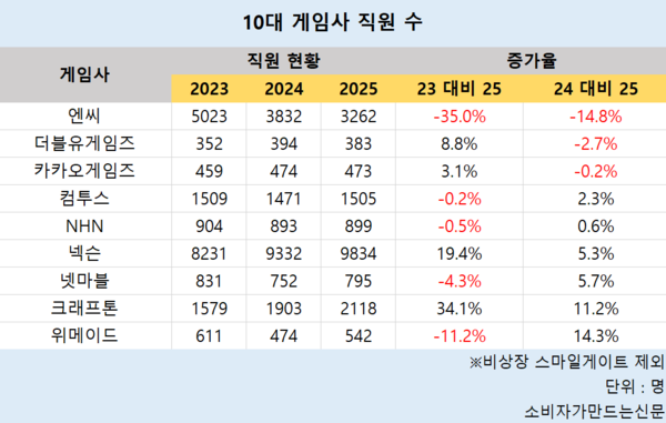 10일 전자공시시스템에 따르면 10대 게임사 중 직원 수는 넥슨이 9834명으로 가장 많다. 이어 엔씨 3262명, 크래프톤 2118명, 컴투스 1505명 순이다. 비상장사인 스마일게이트는 조사에서 제외했다.