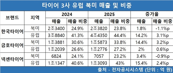 타이어 3사 모두 유럽과 북미 시장에서 매출이 증가했다. 한국타이어와 넥센타이어는 유럽에서, 금호타이어는 북미에서 두 자릿수 비율로 늘었다.