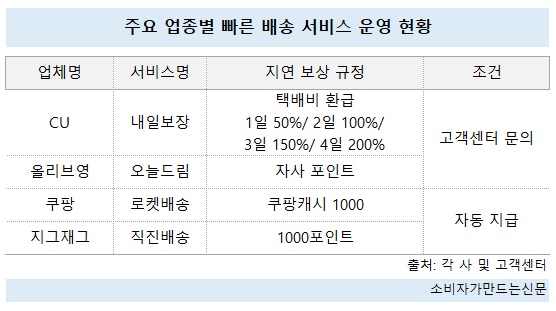 소비자가만드는신문이 빠른 배송을 운영하는 업종별 대표 기업을 조사한 결과 쿠팡과 지그재그는 배송 지연 시 자사몰에서 사용 가능한 1000포인트를 자동 지급하는 것으로 확인됐다. 올리브영과 CU는 직접 고객센터에 문의해야 한다.