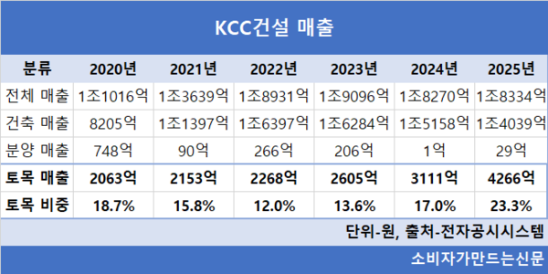 토목 매출은 2020년 2063억 원에서 2025년 4266억 원으로 106.8% 늘었다. 매년 20% 이상 증가했다. 전체 매출에서 차지하는 비중도 2020년 18.7%에서 2025년 23.3%로 4.6%포인트 높아졌다.