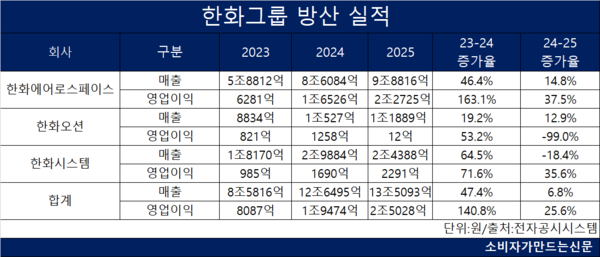 한화그룹의 지난해 방산 매출은 13조5093억 원으로 전년 대비 6.8% 증가했다. 영업이익은 2조5028억 원으로 25.6% 늘었다.