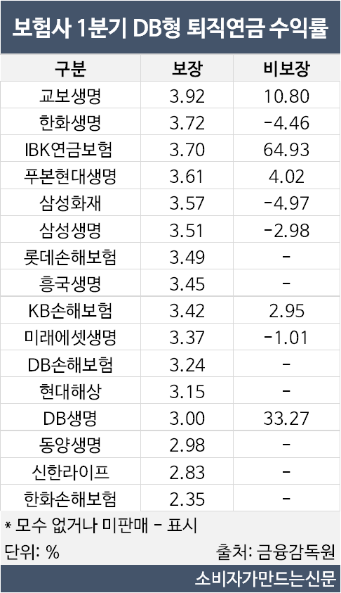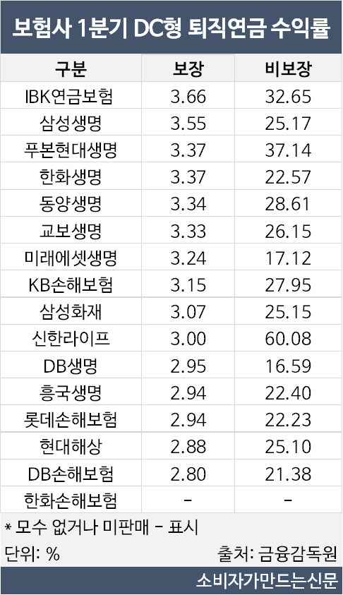 원리금 비보장형 기준에서는 IBK연금보험이 33.6%로 가장 높았고 DB손해보험이 33.14%를 기록해 뒤를 이었다.