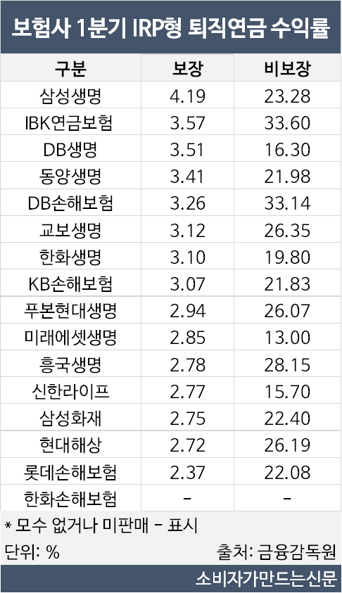 반면 롯데손해보험은 IRP 원리금 보장형 수익률이 2.37%를 기록하며 가장 낮았다.