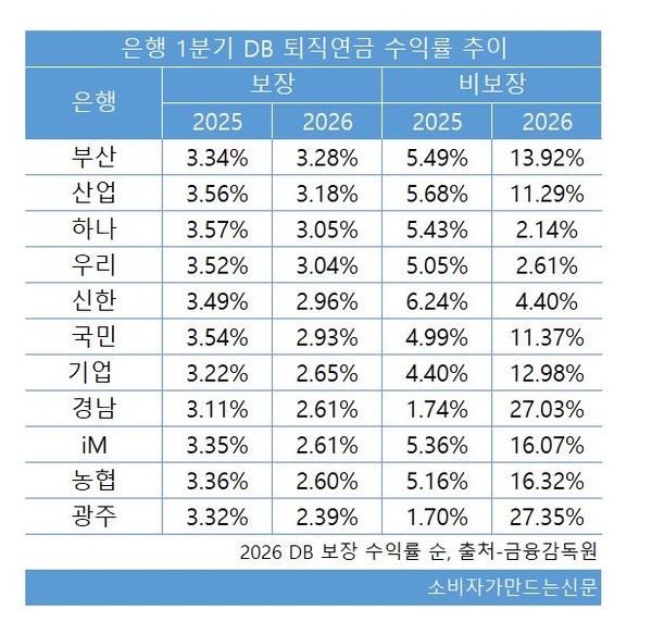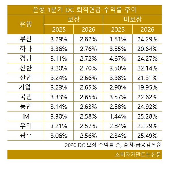 부산은행은 원리금 보장상품 기준 DB형 1년 수익률이 3.28%를 기록해 가장 높았다. 원리금 비보장상품 기준에서도 13.92%를 기록하며 경남은행에 이어 두 번째로 수익률이 높았다.
