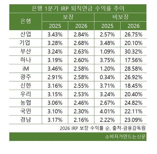 IRP는 모든 은행이 원리금 보장 수익률 2%대를 기록한 가운데 산업은행이 2.84%로 가장 높았다. 다만 산업은행 수익률은 지난해 1분기보다 0.59%포인트 떨어졌다.