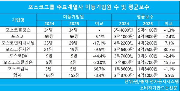 포스코스틸리온은 5명에서 4명으로 1명 줄어 20.0% 감소했고 포스코퓨처엠은 21명에서 19명으로 2명 줄어 9.5% 감소했다. 포스코는 59명에서 56명으로 3명 줄어 5.1% 감소했다. 반면 포스코엠텍은 3명에서 5명으로 2명 늘었고 포스코홀딩스는 34명으로 변동이 없었다.