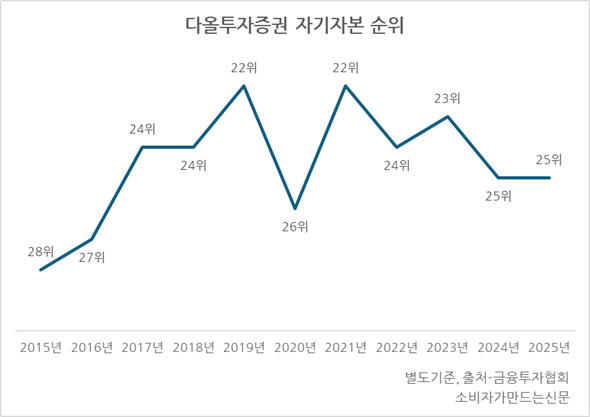 하지만 2022년부터 금리 상승의 여파로 부동산 PF 시장이 침체되자 IB 영업이 위축되고 충당금 부담이 커지면서 실적이 급감했다. 다올투자증권은 2023년 연결기준 순손실 114억 원에 이어 2024년에도 순손실 455억 원을 기록했다. 자기자본 순위도 2021년 22위에서 2024년 25위로 세 계단 하락했다.