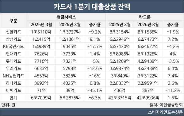 카드론은 3월 말 기준 잔액이 1조1361억 원으로 9.1% 증가했고 카드론도 7.2% 늘어난 6조7473억 원을 기록하며 증가폭이 컸다. 잔액 기준으로는 현금서비스와 카드론 모두 두 번째로 많다.