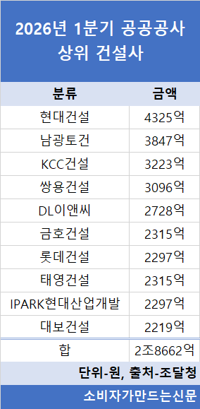 27일 건설업계에 따르면 올 1분기 공공공사 상위 10개 건설사의 수주액은 총 2조8662억 원으로 집계됐다.