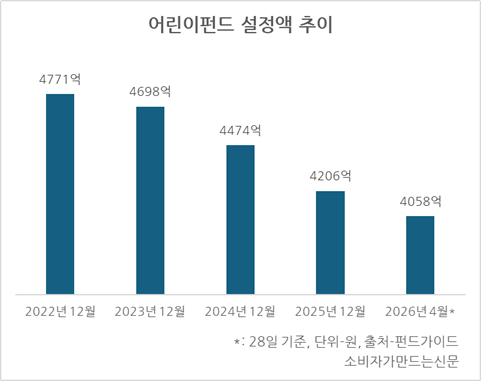 어린이펀드 설정액은 매년 하향 곡선을 그리고 있다. 지난 2022년 말 4771억 원에서 이듬해 4698억 원으로 소폭 감소했고 이후 매년 200억 원 이상 순감소하고 있다.