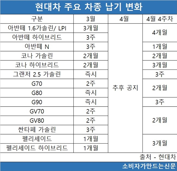 현대차 관계자는 “납기표는 상황에 따라 변동 가능성이 있으며 생산 정상화를 위해 노력하고 있다”고 말했다.